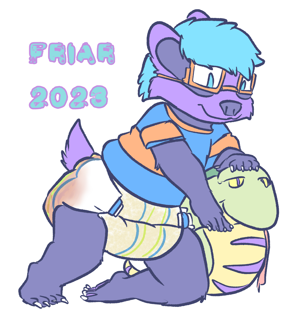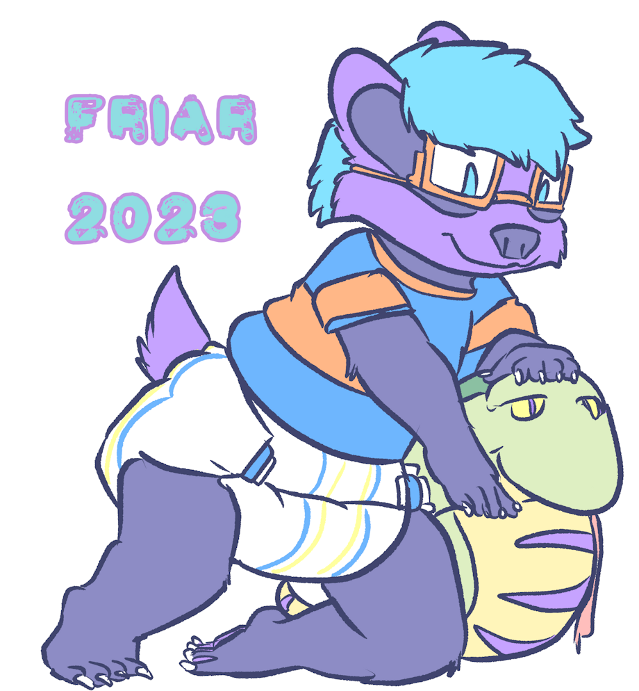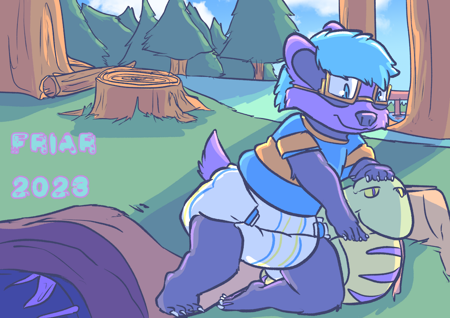 Illustration of Everett the wet and messy diapered badger with his snake plushie outside of a hole in the ground in the forest.
