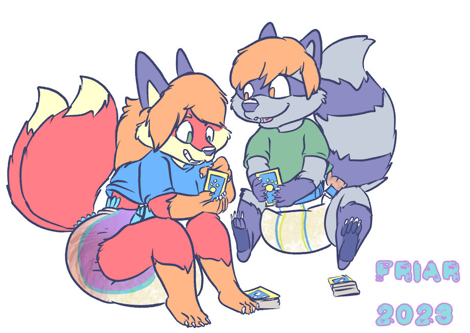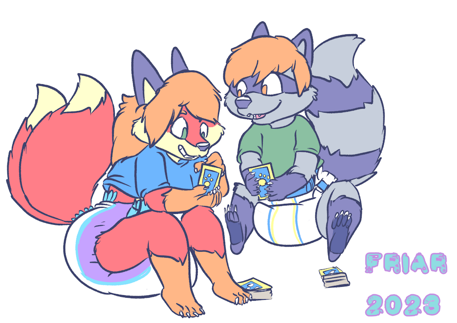 Illustration of Ozzy the wet and messy diapered two tailed fox and Tylahn the wet and messy diapered raccoon playing with trading card games in the treehouse.