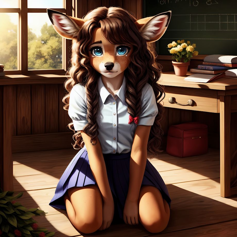 Prompt 1: (AS-YoungestV2:1.3) Good Morning Stable Diffusion, please create a stunning visually compelling digital art piece. Make is a masterpiece with inspiration from fantasy elements with bright vivid colors and a detailed background, capture every intricate detail. Create a dramatic cinematic experience focusing on a lone solo female furry Deer. Make her approximately 12 years old in age. She will be wearing a school uniform featuring a teal skirt and a white button up shirt and wearing a teal hairbow in her long brown curly hair. She has cute teal eyes and freckles on her shy innocent face. She had fluffy brown fur from her face all the way down to her hooves. She is facing the viewer but is looking down towards the floor submissively with her arms down in front of her. She is sad with her ears drooping. She knows she is in trouble. She in in the school principal's office, surrounded by vintage wooden furniture. There is a desk behind her and she is kneeling in the center of the room. There is a window outside that provides a beautiful nature view with bright shining rays of light glowing through the glass. It is a beautiful sunny day but the room itself is dark and mysterious. The young deer girl is about to receive a lecture about her inappropriate behavior. Her eyes are watering, she can feel herself about to cry but she is trying to hold herself together because deep down she knows she is a good girl. <lora:Furtastic_Detailer:0.5> Negative prompt: (AS-YoungV2-Neg:1.3), badhandv4, bwu, dfc, easynegative, ubbp, updn, antlers, teal_hair, Human, NSFW, Cleavage, Pubic Hair, Nudity, Naked, Au naturel, Watermark, Text, censored, deformed, bad anatomy, disfigured, poorly drawn face, mutated, extra limb, ugly, poorly drawn hands, missing limb, floating limbs, disconnected limbs, disconnected head, malformed hands, long neck, mutated hands and fingers, bad hands, missing fingers, cropped, worst quality, low quality, mutation, poorly drawn, huge calf, bad hands, fused hand, missing hand, disappearing arms, disappearing thigh, disappearing calf, disappearing legs, missing fingers, fused fingers, abnormal eye proportion, Abnormal hands, abnormal legs, abnormal feet, abnormal fingers Steps: 50, Sampler: DPM++ 2M Karras, CFG scale: 15, Seed: 2539419749, Size: 768x768, Model hash: 8F73E38CB3, Model: domesticatedMix_v13, Denoising strength: 0.7, Hires upscale: 1.5, Hires steps: 150, Hires upscaler: R-ESRGAN 4x+ Anime6B, Lora hashes: "Furtastic_Detailer: 2e94914f676c", TI hashes: "AS-YoungV2-neg: bb190ae47836", Version: 1.6.19, Diffus task ID: 8d888f47-1d15-4afb-ae9d-2c8514cb9a03, Image created at: "https://webui.graviti.com" |