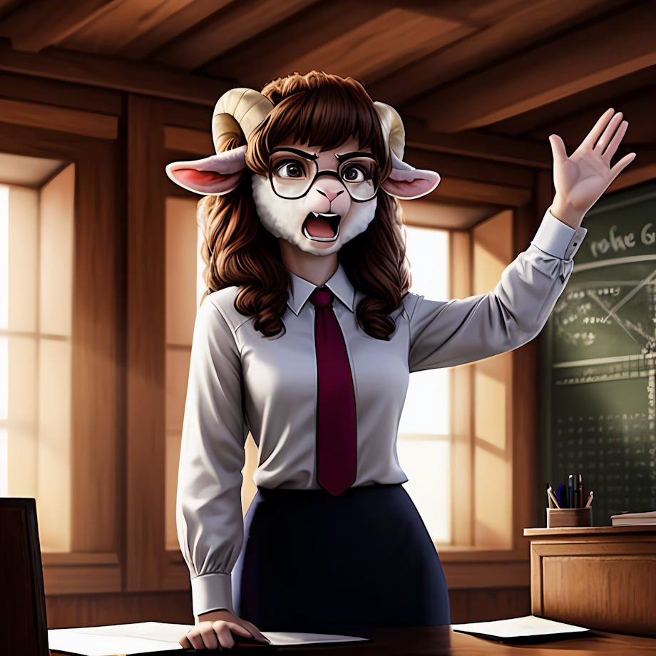 Prompt 2: (AS-YoungestV2:1.3) Good Morning Stable Diffusion, please create a visually stunning masterpiece with elements of fantasy, digital art, a natural nature features. Make sure the background is detailed with intricate wooden furniture in a school office. There is a window that letting in rays of light. There is a Furry Female Sheep standing in the room. She is an adult teacher wearing a professional outfit. She is angry. The viewer is viewing a dramatic cinematic close up on her face as she angrily yells and lectures. She is pacing the room, waving her hands in the air. She has white fur and brown hair. She is wearing glasses on her face and she has horns that a typical sheep would have. She normally has a gentle nature but the behavior or the child in front of her has been completely unacceptable. She has soft feature against her soft fluffy fur. She is standing in front of her desk just outraged and sad inside. <lora:Furtastic_Detailer:0.5> Negative prompt: (AS-YoungV2-Neg:1.3), badhandv4, bwu, dfc, easynegative, ubbp, updn, antlers, teal_hair, Human, NSFW, Cleavage, Pubic Hair, Nudity, Naked, Au naturel, Watermark, Text, censored, deformed, bad anatomy, disfigured, poorly drawn face, mutated, extra limb, ugly, poorly drawn hands, missing limb, floating limbs, disconnected limbs, disconnected head, malformed hands, long neck, mutated hands and fingers, bad hands, missing fingers, cropped, worst quality, low quality, mutation, poorly drawn, huge calf, bad hands, fused hand, missing hand, disappearing arms, disappearing thigh, disappearing calf, disappearing legs, missing fingers, fused fingers, abnormal eye proportion, Abnormal hands, abnormal legs, abnormal feet, abnormal fingers Steps: 50, Sampler: DPM++ 2M Karras, CFG scale: 15, Seed: 2101273589, Size: 768x768, Model hash: 8F73E38CB3, Model: domesticatedMix_v13, Lora hashes: "Furtastic_Detailer: 2e94914f676c", TI hashes: "AS-YoungV2-neg: bb190ae47836", Version: 1.6.19, Diffus task ID: d9bfddbc-e9fe-4f6a-9f9e-7b8b406ebdb0, Image created at: "https://webui.graviti.com" |