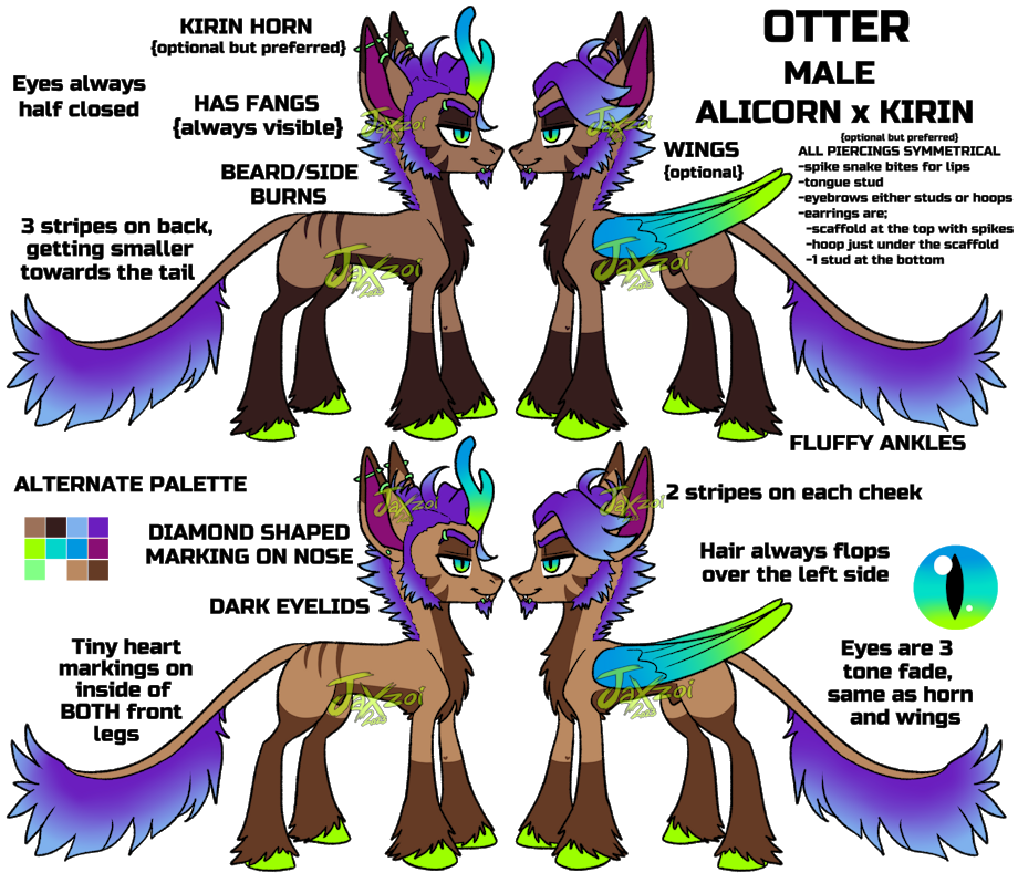 bc i made nuka a ref i realised i still had to make otter's one as well so here it is!! idk if he really is an alicorn or a kirin hes a big old mixmatch of stuff i liked on ponytown LMAO he accidentally got an alt palette bc of a weird thing someones phone did who did an art trade with me LMAO and i liked the colours enough to make it part of his actual thing dfhlsdfds HIS TONGUE IS THE SAME COLOUR AS HIS HOOVES wings are optional and usually never a thing i draw honestly LMAO but HIS HORN.. idk why i have it optional bc i love it so much i think its permanant uwu also his piercings arent optional but idm if they get forgotten i guess xD this ref is honestly kind of a mess lmao the text is all over the place and ugh lol