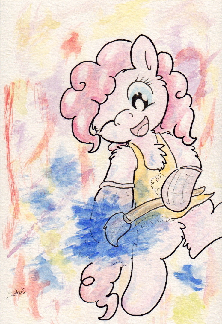 Messy art happens when Pinkie puts on her messy art equipment (which is also what she uses to cook cupcakes with little fillies, but no matter). She broke into my very canvas.. she can do that, I guess. Nothing is safe - in fact, she splashed half of my drawing room!