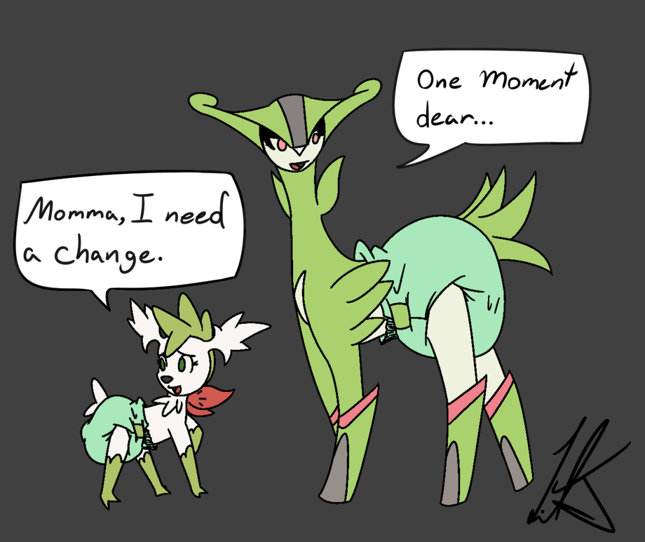 Okay, so I commissioned Liljdude on FA to draw me Shaymin and Virizion in diapers, and here is the result. :3 Isn't it awesome! Love, love, love it. Oh, he just did the lineart/inking, though. I had some friends do the coloring. Posted with permission, of course. Here is the rundown: