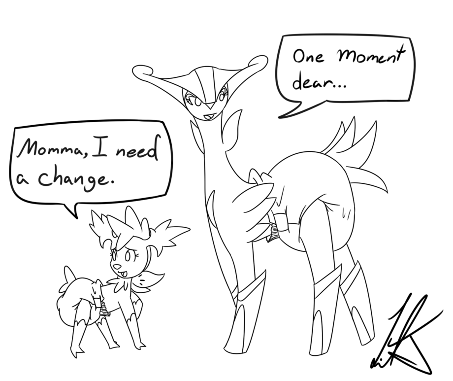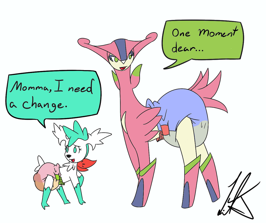 Okay, so I commissioned Liljdude on FA to draw me Shaymin and Virizion in diapers, and here is the result. :3 Isn't it awesome! Love, love, love it. Oh, he just did the lineart/inking, though. I had some friends do the coloring. Posted with permission, of course. Here is the rundown: