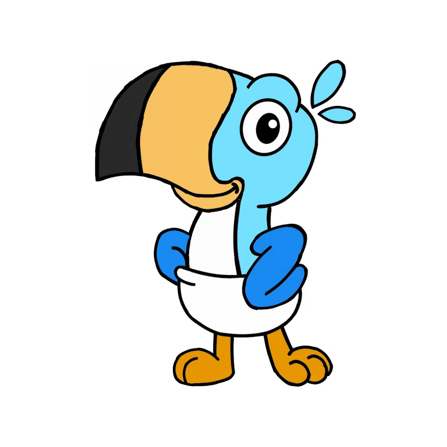 Terry is a one-year-old baby toucan who likes adventure and action. He also has a light orange and black-colored beak, great smell senses, no ears, although he can entirely hear, which is okay, teeth that aren't sharp, two standard blue arms, two orange-colored legs, three toes, and light blue fur. He also does not have a tail, like Axel, and is not trained to use the restroom, so he also regularly poops and pees himself if he feels the urge to do those, and he can also sometimes fart by accident. He can also speak a variety of different languages perfectly, and he can understand them very well, even in forms of those languages, including baby speak, which he can translate and understand, as well. He also happens to speak baby speak, but very rarely.
