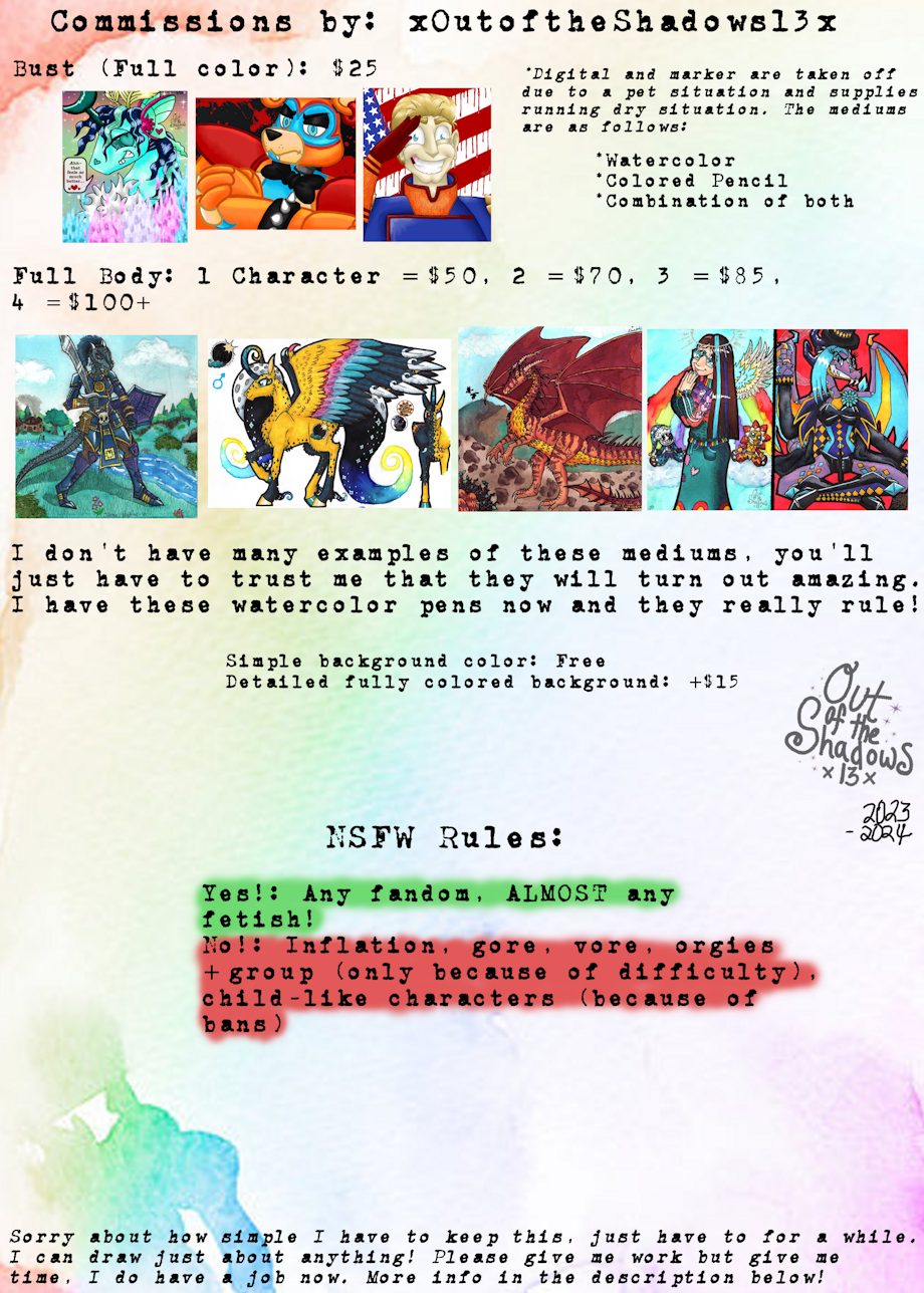 So, why is this considered an "emergency" commission sheet? Because I had to leave the toxic and crazy job I was at, I would have went to the hospital if I had to keep going (probably even the mental hospital for a second time in my life)...I am very much struggling with my physical and mental health and don't really get much help for it. I am trying to get government help and will be looking for a better suited job in the mean time, but until then, I am willing to lower my prices and get some artwork done in order to make some kind of money for myself. Not to give out this complete sob story but I have to stay living with my ex-boyfriend and it happened mostly because I'm trans and the relationship was already on a downward spiral, he treats me so differently than how he used to. You'd be helping keeping me afloat in a harsh "every person for themselves" kind of environment at home, and get some artwork in return. Sounds like a win/win to me.