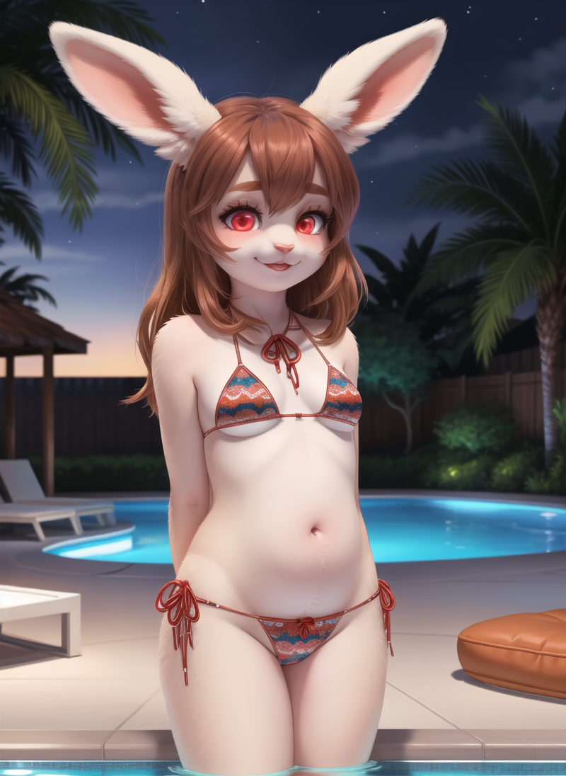 outdoors, cowgirl shot, standing, poolside, arms behind back, side-tie bikini bottom, frilled bikini,