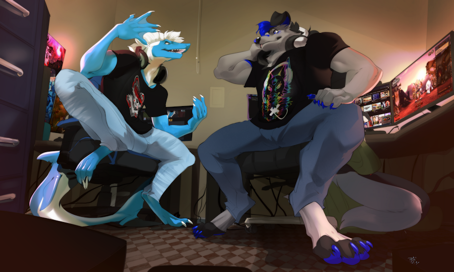 This is part one of two of an awesome commission my husband and I got for our (late) 9th wedding anniversary depicting out PC gaming room at the house. Peritian did an awesome job on this, as always <3!