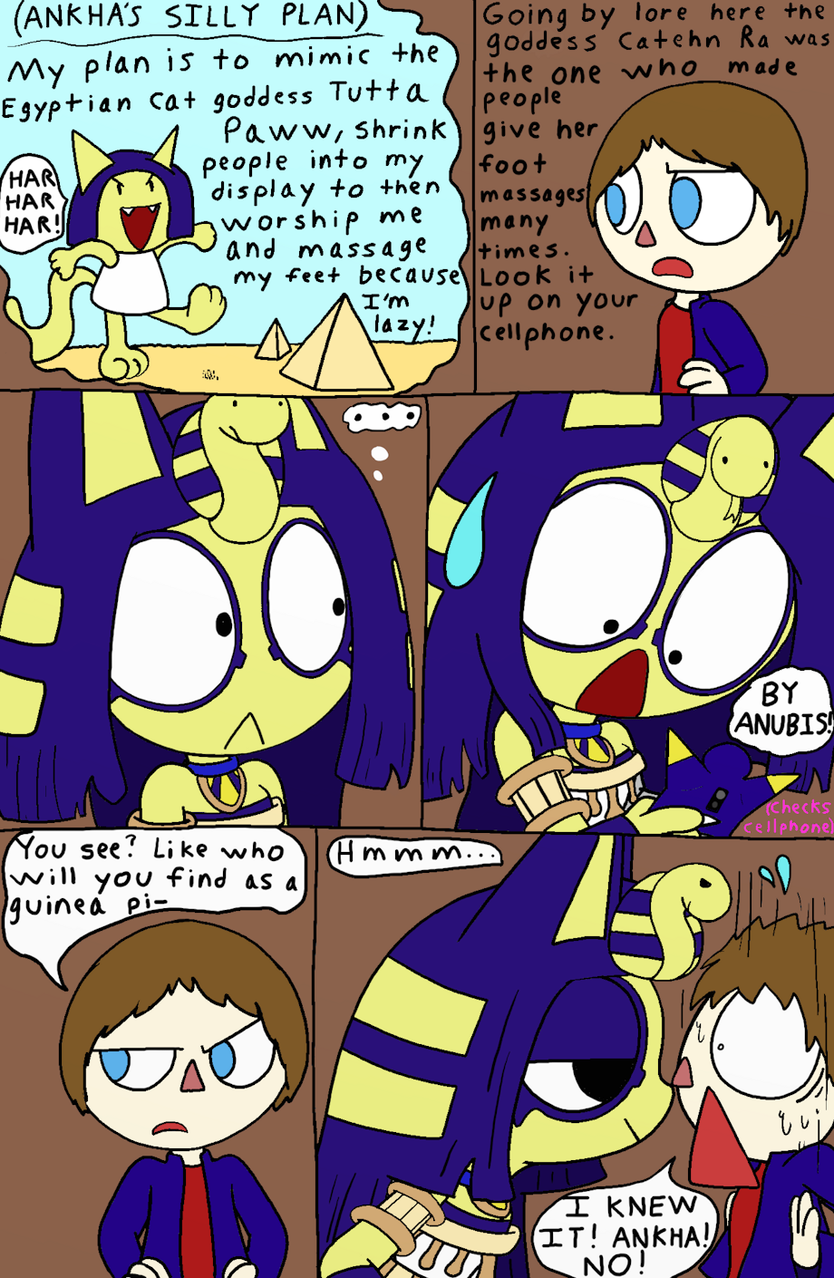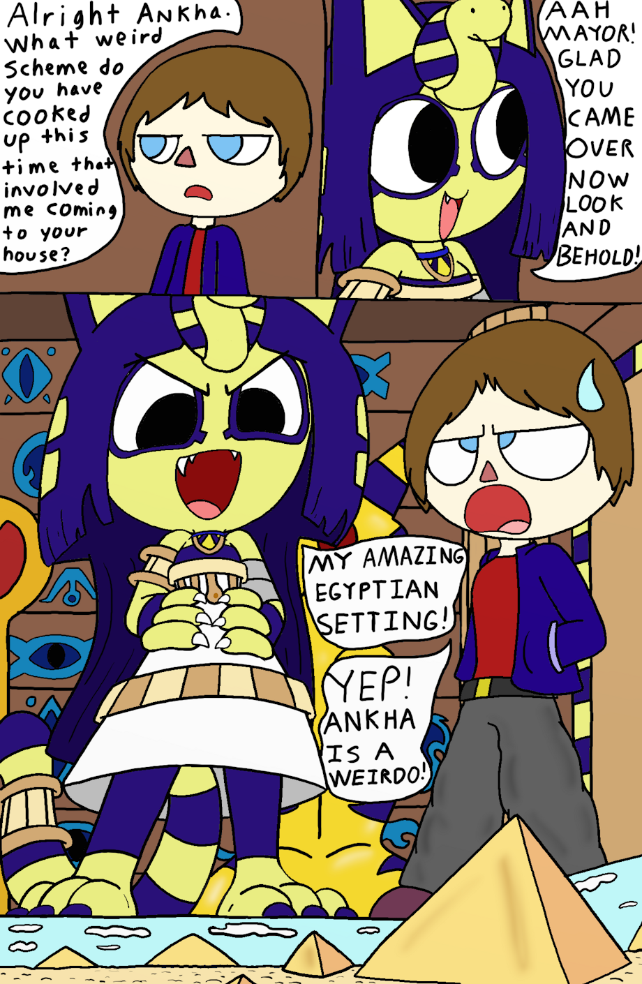 This piece is centered around Ankha creating an ancient Egyptian model set in her home and brought the mayor over to "test it" by shrinking him and making her worship her. She planned to shrink all of the animal citizens in town then have them worship her inside of this model set dressed in ancient Egyptian attire for some time so she can be ready to rule over them in goddess form. She always tricks the mayor into coming to her ho,e or another location to set him up for weird situations like worshipping her feet.