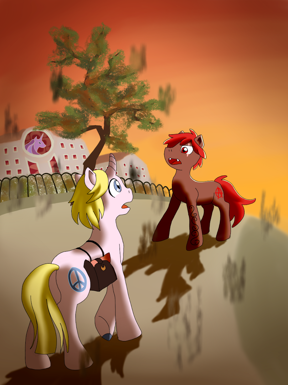 Fanart for chapter 1 of the epic fanfic my friend, then going by the name Caramel the Unicorn, began in 2017... and has since purged from the Internet, I don't even know if I still have a copy. A threatening stranger appears before the heroine, a normal schoolpony, and beckons her with a call to adventure, while the very universe around them crumbles and slowly dissipated into nothing! What decision will Caramel make when presented face to face with this mortal danger?