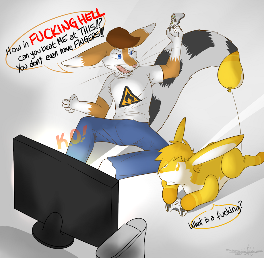 Heh, looks like Kendall isn't as good at that fighting game as he originally thought, as Arf of Rawr's just whipped his ass in it. Probably several times in a row!