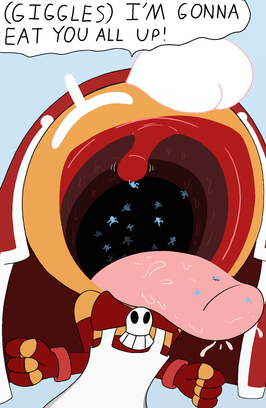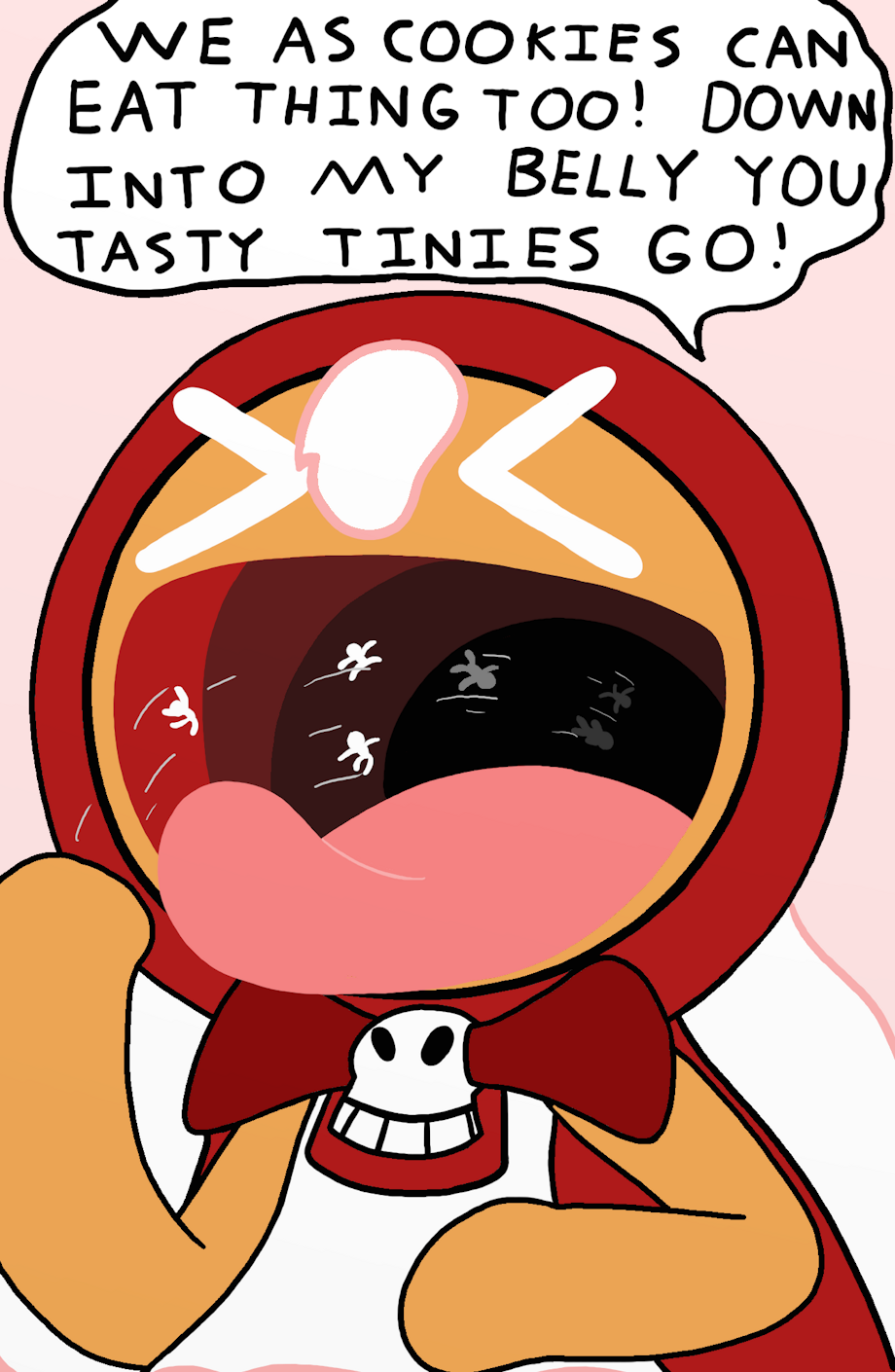 Cherry Cookie has a massive mouth which is perfect for vore situations so I drew her swallowing tiny marshmallow people down because getting swallowed alive by a living cookie creature is the biggest form of irony towards the very humans who created them. She even eventually ate the ones she stepped on as well, all plummeting down to her large stomach waiting to embrace them.