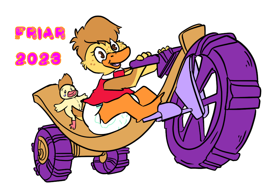 Illustrated commission of Tulip the diapered duck girl riding her big wheel with her plushie in tow.