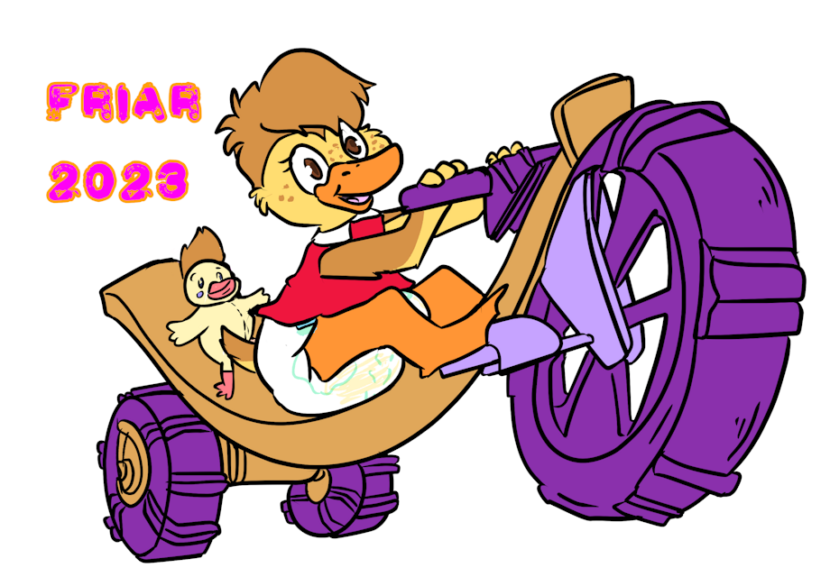 Tulip riding her tricycle with her ducky plushie riding along behind her