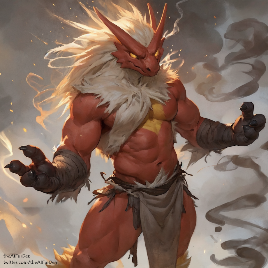 Prompt: male, dragon, reptile, horns, muscle, scales, detailed scales, blaziken, handpainted style, fire, ash in background
