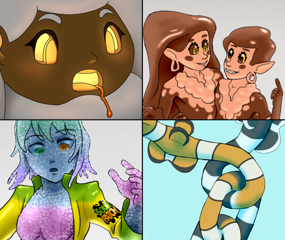 This months sketch roundup features 8 illustrations. The four here, Calem has lost his head, and it's been hollowed out to become a jack-o-lantern for Halloween. A picture of slime buddies Oozey & Goozey, merging together. Another victim of the Candy Coven, sees someone transformed into a Sour Patch Kid gummie! And Tola & Neru, chain link together. There's also another short Nick TF sequence.