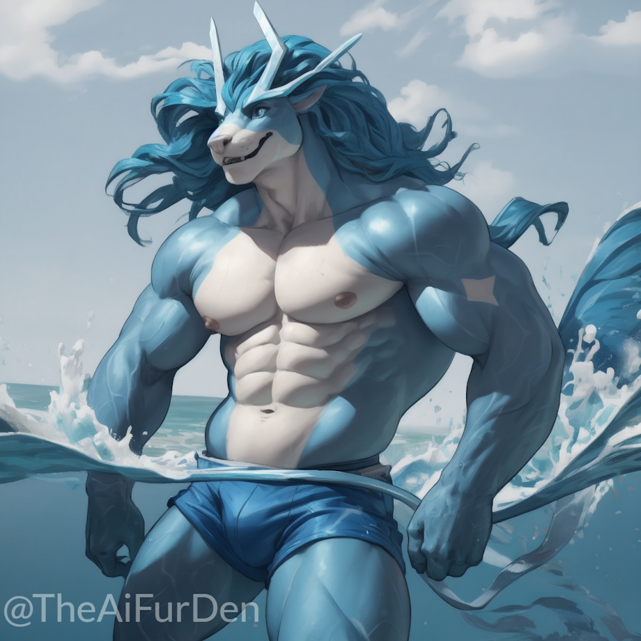 Prompt: suicune, beach, speedo, sea, ocean, waves, swimming, muscle, male