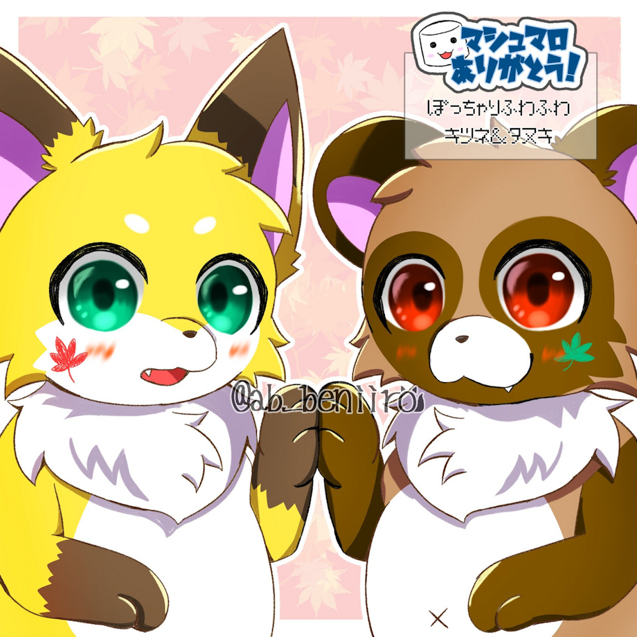 ぽっちゃりふわふわのタヌキとキツネです