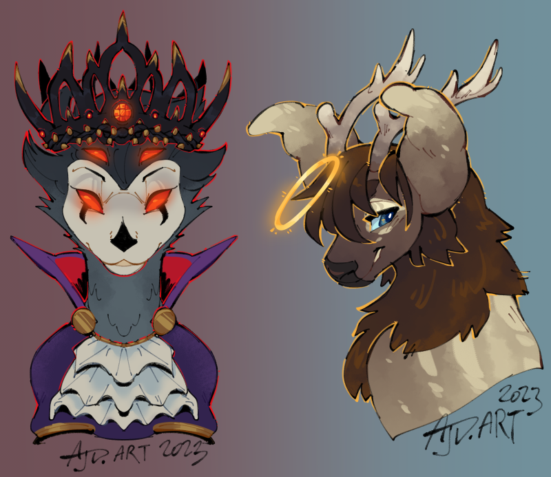 Trade with Voo for a bundle of cute lil characters. They wanted me to draw busts of a couple of their pillowings, the Stolas themed one was especially fun!!! I haven't seen elk lad in such a long time too, so great to get to draw older designs! ;v;