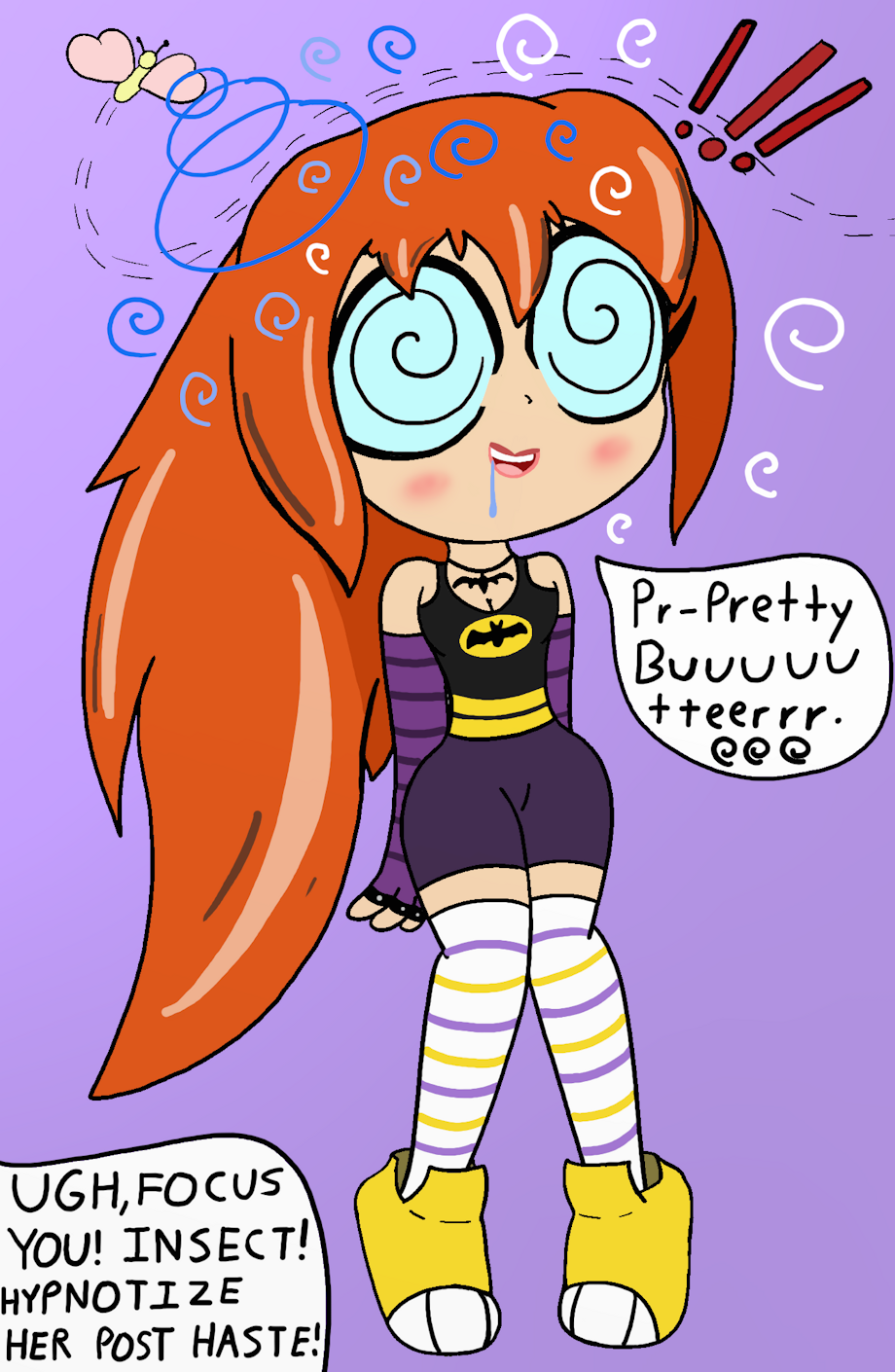 There is a couple episodes that's directly at the beginning which shows how all of the girls met each other: Batgirl, Zattana, Supergirl, Bumblebee, Wonder Woman and A Green Lantern (they all have human names, but I'm gonna just call them by their hero names a lot). Wonder Woman is new to the human world and knows nothing about it's ins and outs, making her the most oblivious out of all of them, but she's the most battle hardened out them all with the most combat experience. During one of those early episodes she put the other 5 into training. During one part of the training Batgirl was distracted by a butterfly flying around her which was one of her biggest flaws I mentioned in the previous picture. She's easily distracted and hyper-active despite being the most intelligent out of everyone aside from Bumblebee. I decided to add onto this by having Wonder Woman order Karen to hypnotize her with a device she carried with her so she'll focus better. She'll be focusing now.