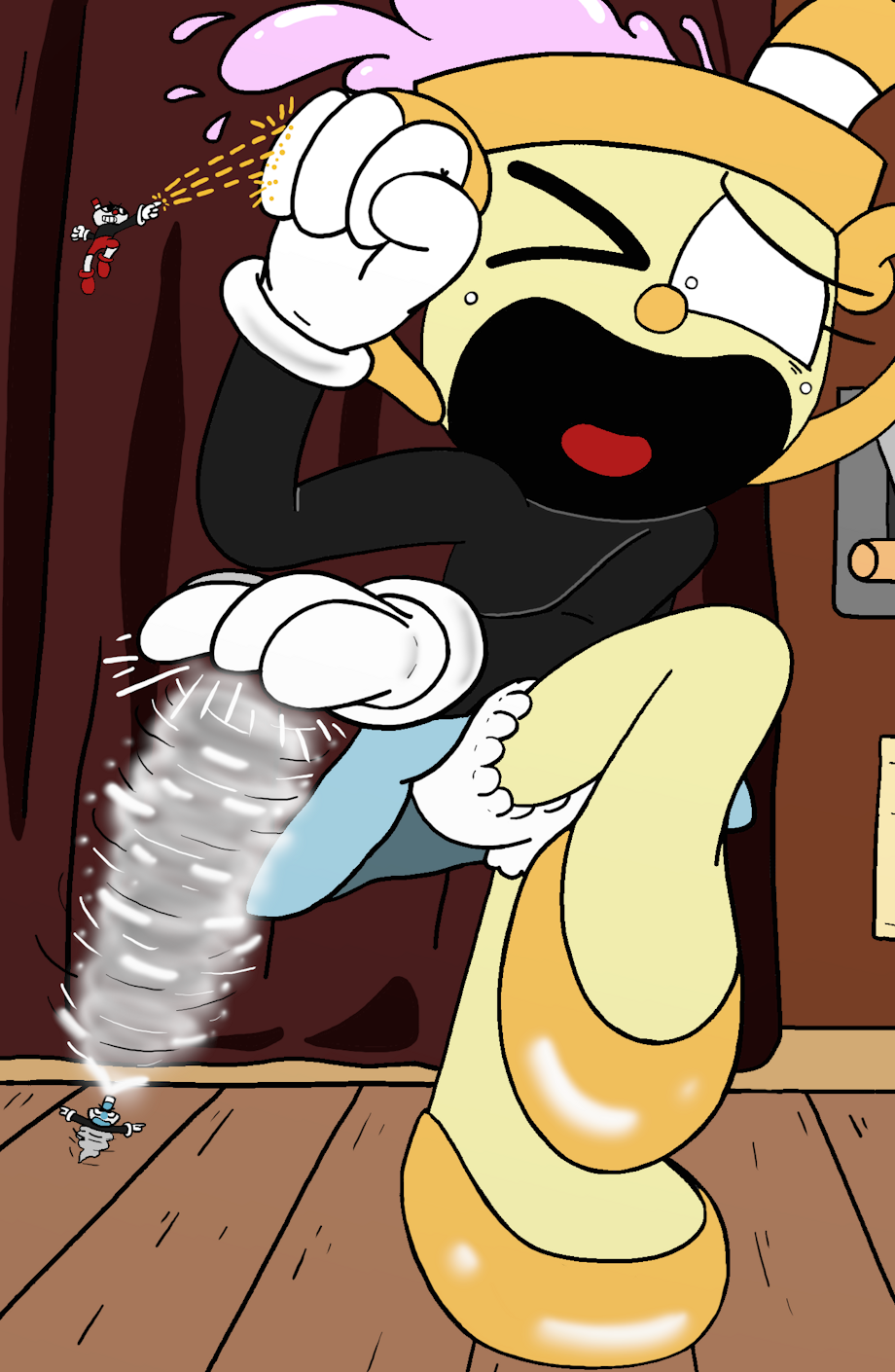 After Chalice put the cup brothers through her own weird boss fight she got the results she wanted. Every time they were defeated by her (excluding the outcome where she traps them inside of her eyes. I decided to keep that one an official defeat for them) she showed pity on them and acknowledged how they fought as hard as they could despite following up with each defeat. Chalice sat down backstage had some of her workers bring a unique TV she made that would give a vision of the brothers defeating Chalice in battle. She still kept them small because though because she wanted to until later, but allowed them to swim inside of her cup juices because cup humanoids must have some sort of magical juice inside of their heads that never splash out so easily for the comedy. After the vision video she congratulated them for their determination and no-quit attitude during the fight and performed a show for them.
