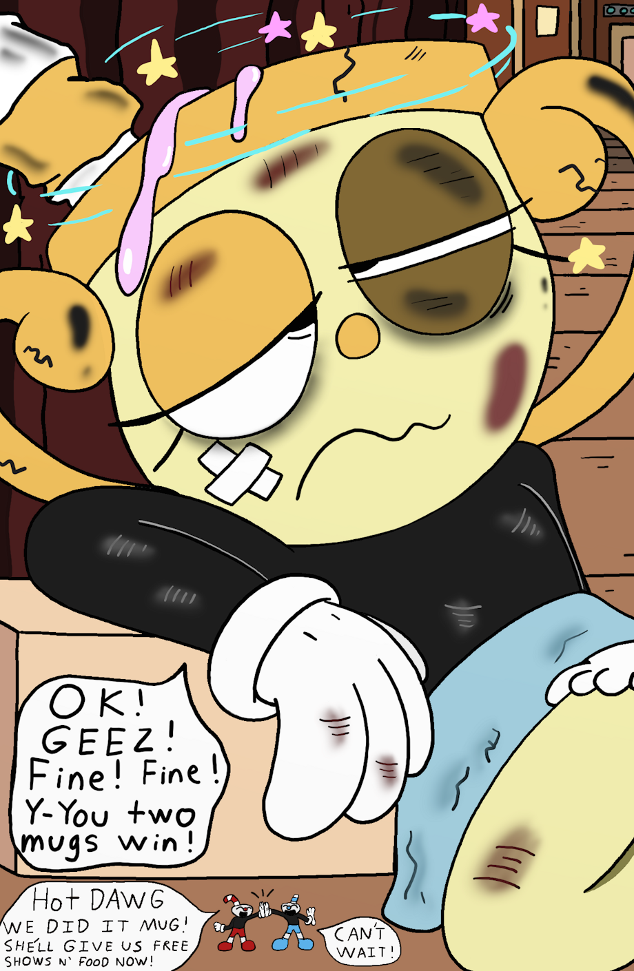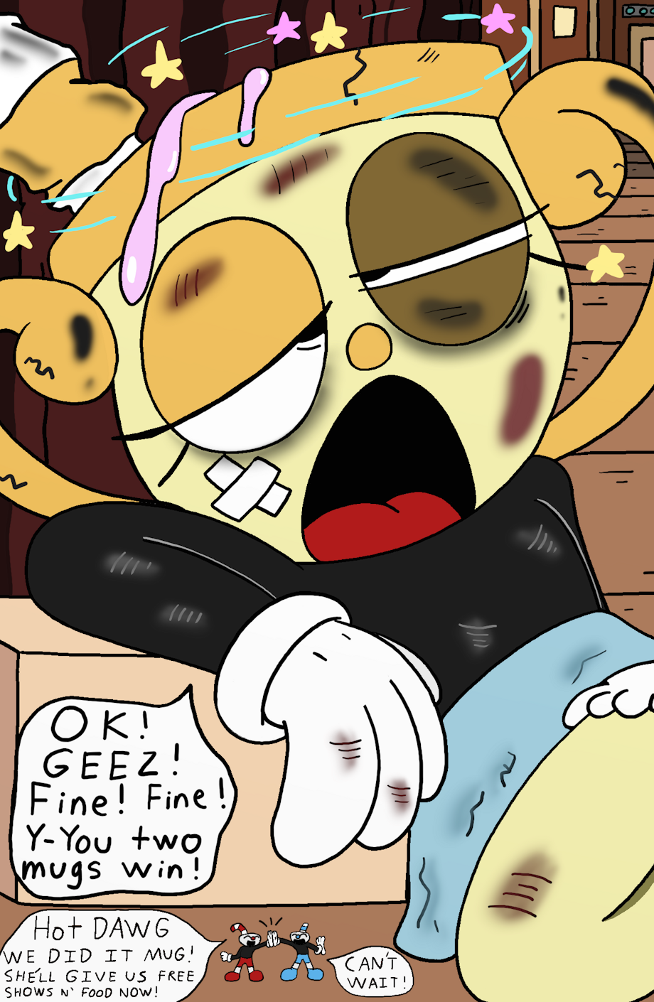 After Chalice put the cup brothers through her own weird boss fight she got the results she wanted. Every time they were defeated by her (excluding the outcome where she traps them inside of her eyes. I decided to keep that one an official defeat for them) she showed pity on them and acknowledged how they fought as hard as they could despite following up with each defeat. Chalice sat down backstage had some of her workers bring a unique TV she made that would give a vision of the brothers defeating Chalice in battle. She still kept them small because though because she wanted to until later, but allowed them to swim inside of her cup juices because cup humanoids must have some sort of magical juice inside of their heads that never splash out so easily for the comedy. After the vision video she congratulated them for their determination and no-quit attitude during the fight and performed a show for them.