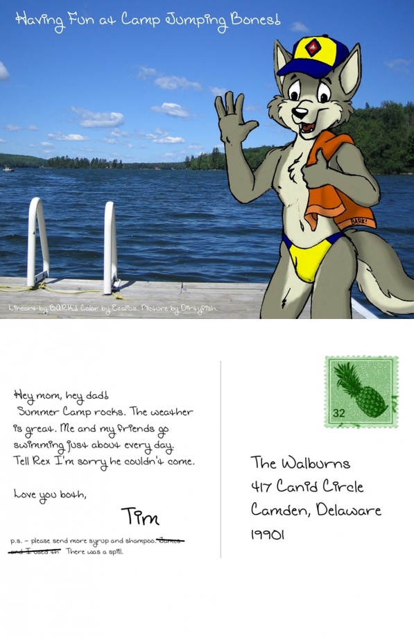 Now I don't recall from my youth if BSA sold blue & gold swimsuits, but let's say they do. They go very well with the hats, and as a bonus they make for better visibility underwater. My only regret for this image is that I don't care enough about the postcard part to fix up the stamp with some squiggly stamp lines.