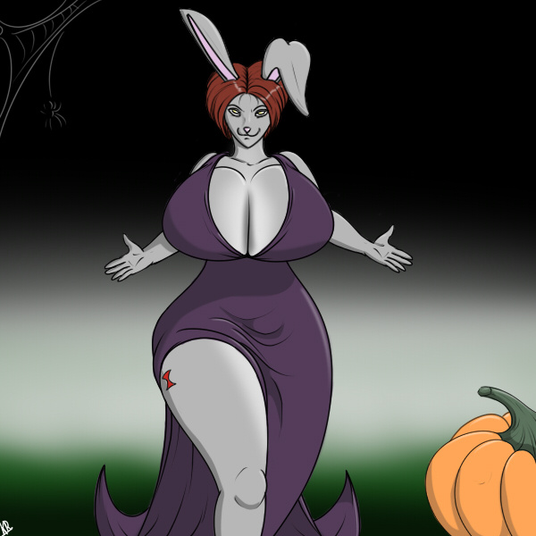 A temptress bunny woman, curvaceous and thick thanks to who knows what powers, potions or pacts! She has a look in her eyes that could mean many things, good or ill. All we know is, she's spooky hot!~