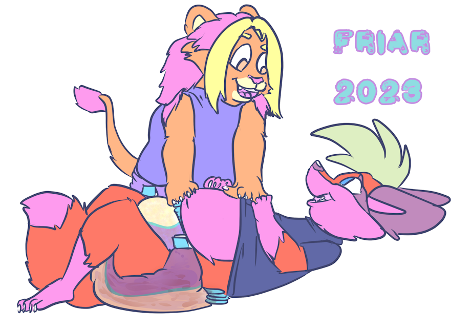 Illustration of Friar the diapered lion rubbing Berry the wet and messy diapered fox's very full tummy in the crib.