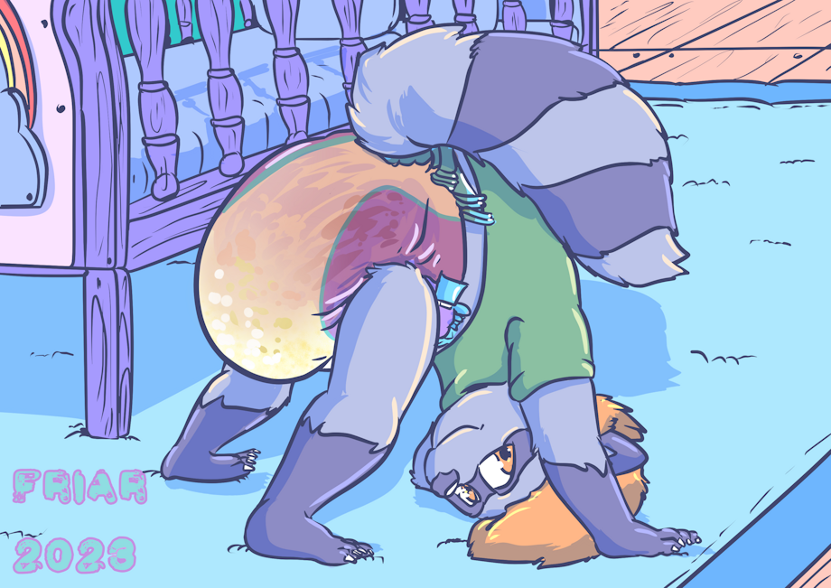 Illustration of Everett the wet and messy diapered badger cuddling his snake plushie in bed and filling his diaper.