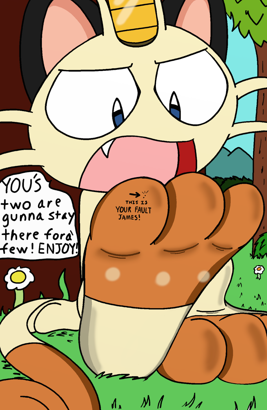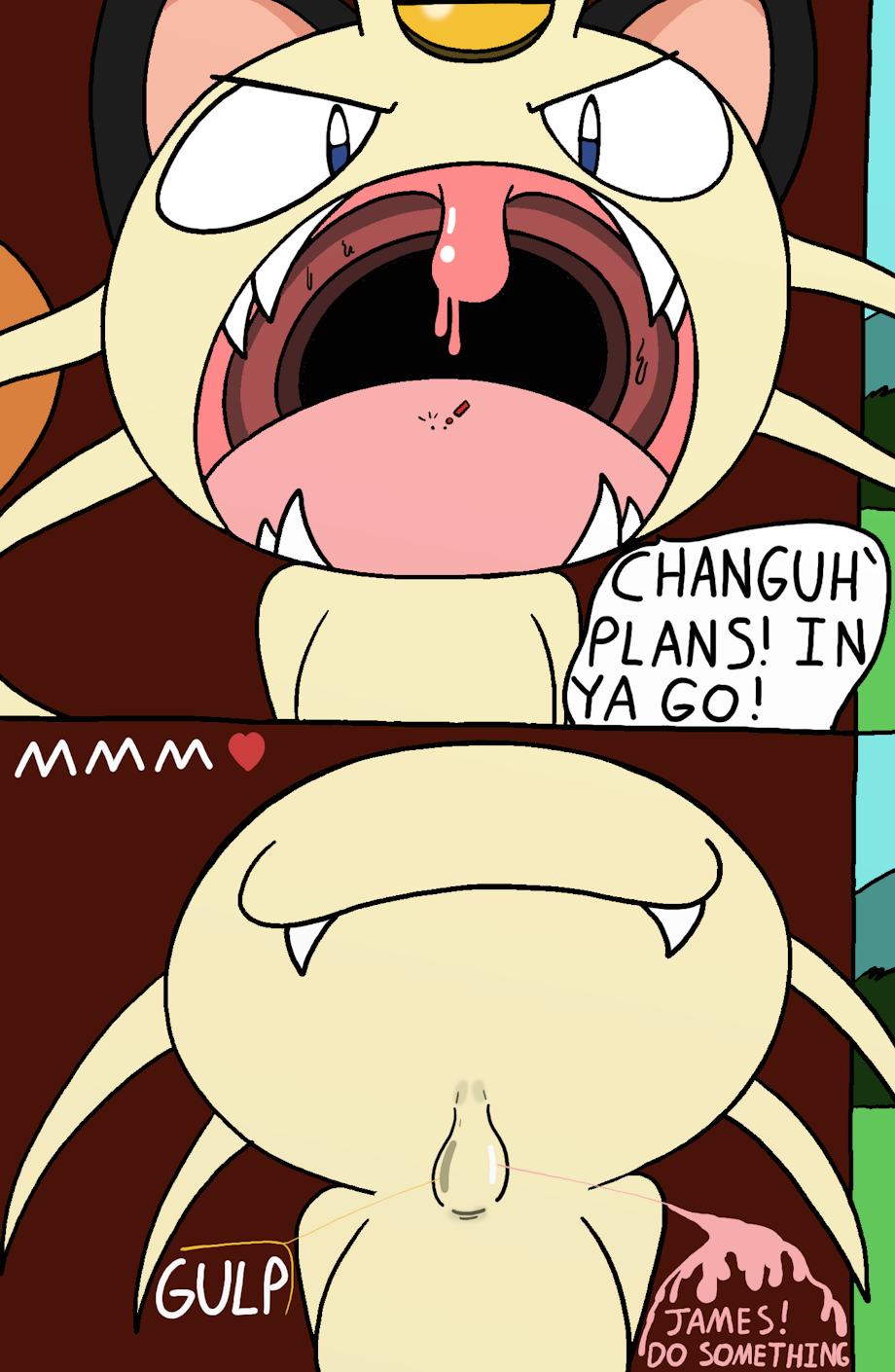 The Team Rocket Meowth was able to escape the girly male Alolan Meowth from earlier despite him letting Meowth go on purpose cause he knows that he'll be thinking about him a lot. To try to fight his sexual thoughts towards the Pokemon variant Meowth decided to take his frustration out on his two long time partners by using the effects of the altered move Minimize on them. He first made them massage his paw toes as punishment then he then proceeded to swallow them both whole in one big gulp. Jessie and James started blaming each other like they would usually do while they were sitting inside of their feline partner's belly. Meowth won't digest his two good friends, but he won't let them out anytime soon either.