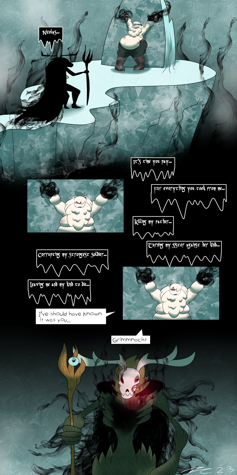 Who could have abducted Santa? It seems like it was an old enemy from the wars for the Northern Lights. Grimmnacht, a wendigo that once lead legions of demons against viking settlements who guarded the Northern Lights and the magic they hold. What has Santa done to incur Grimm's wrath?