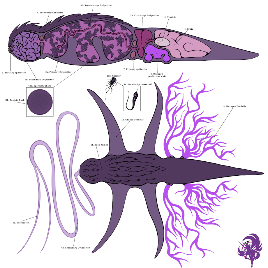 There are no females, only males that uses a complex process to multiply. The internal structure is almost the same as Varen's again. Thought quite smaller. The two kinds of Gametes(13.) generated in these are quite special.