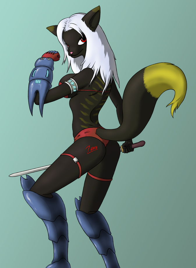 A standalone character piece I drew one day when I was really frustrated with some mods and a little bored of doodling porn all the time. I wanted Yana to be a uniquely colored character and somewhat of a bad ass so she's got dark furr and has some typical female "armor" and a pointy metal thingy for the purposes of killin fools.