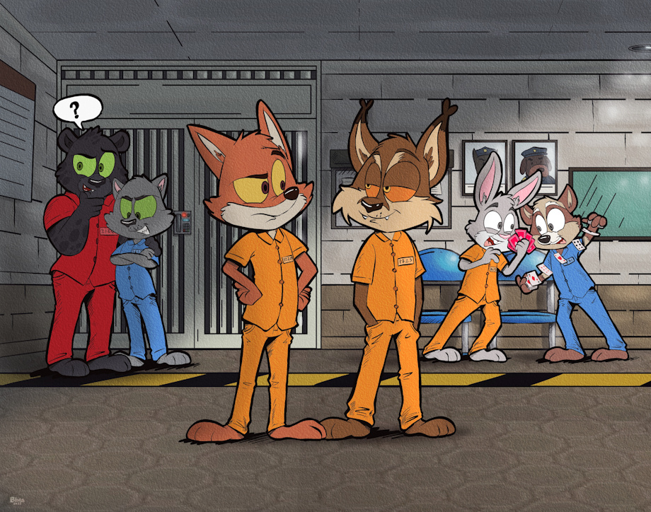 Boulderton Prison inmates from the furry prison RPG game Back To The Dawn. Bob The Black Panther (will be a playable character later), Bam The Grey Cat, Thomas The Fox (main playable character), Chris The Lynx, Whitey The Rabbit and Noodle The Raccoon (they are magicians)