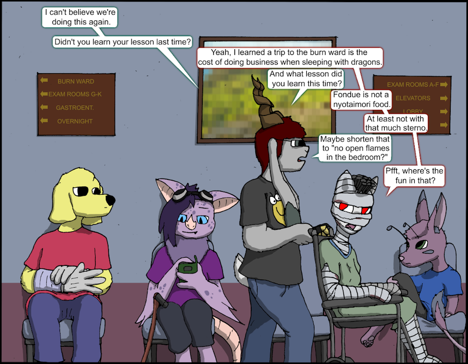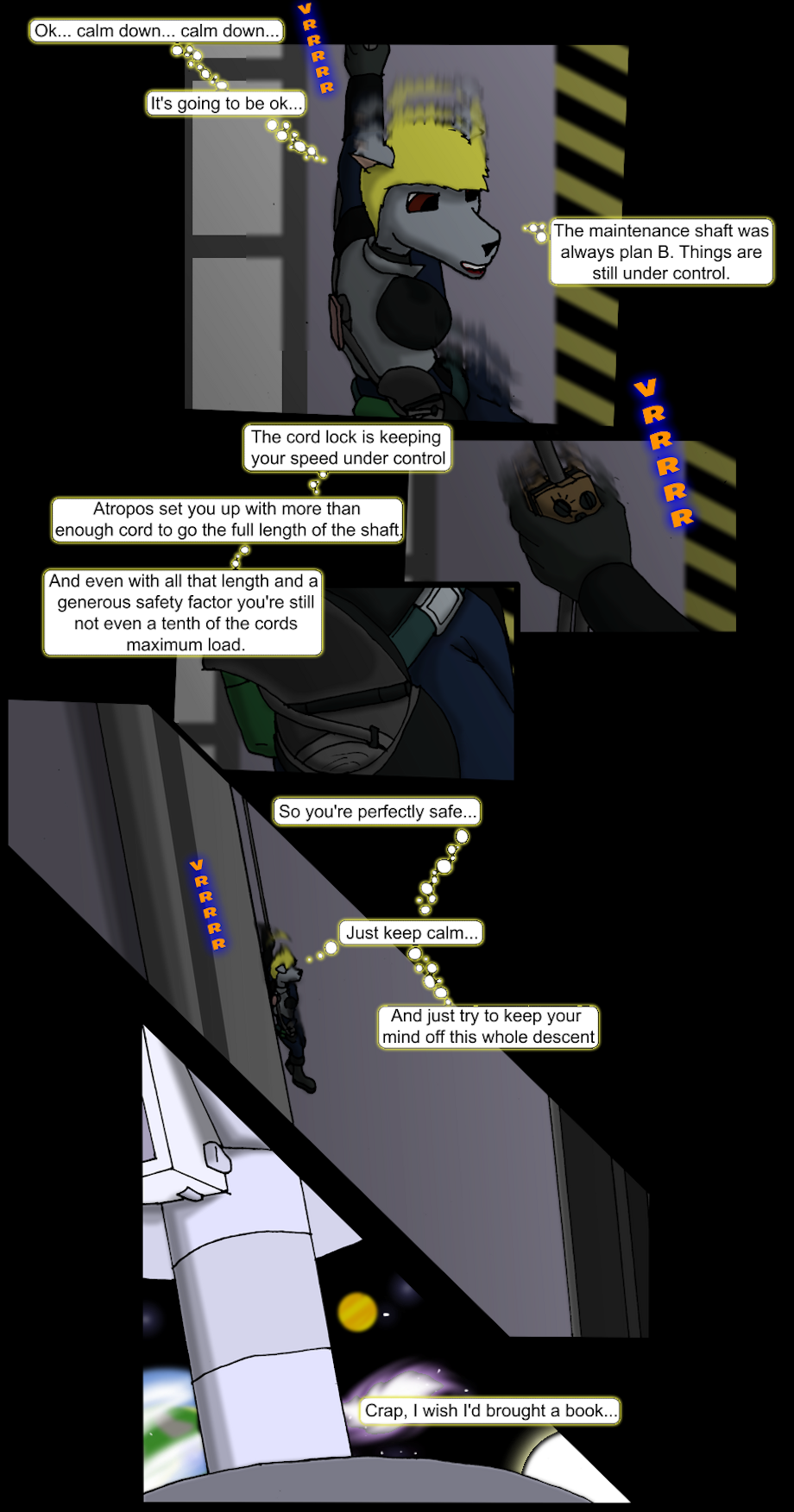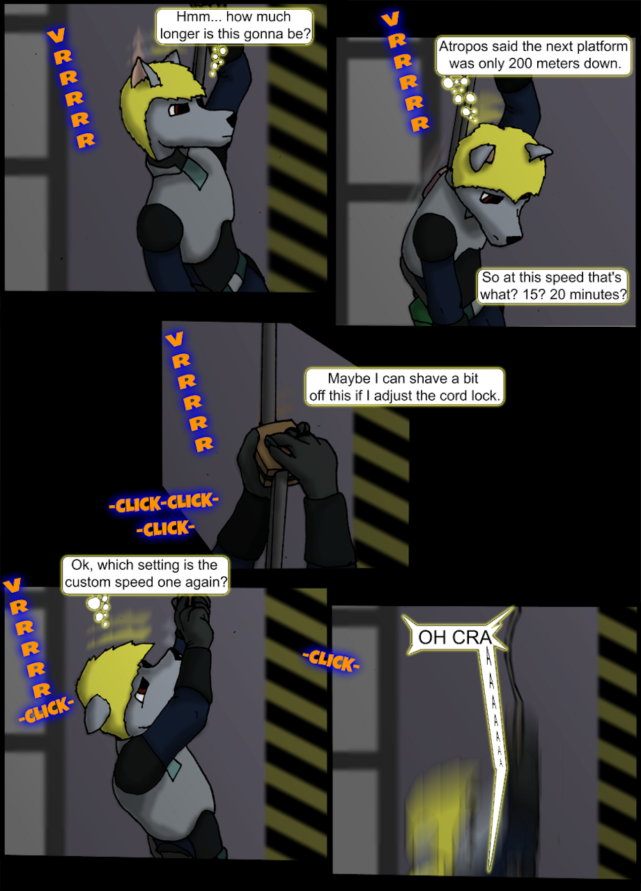 So the story behind the late update is that there was a minor workplace disaster at my day job. The result of which is that I'm still pretty sore from the efforts involved in fixing it, especially in my hands. I'd like to say the rest of the week will be on track but between a work meeting tomorrow and a party on Friday (or more specifically the prep for it) I'd say we're in the yellow range of warnings for Friday's update. Hopefully I can squeeze it in on time but this is just a heads up.