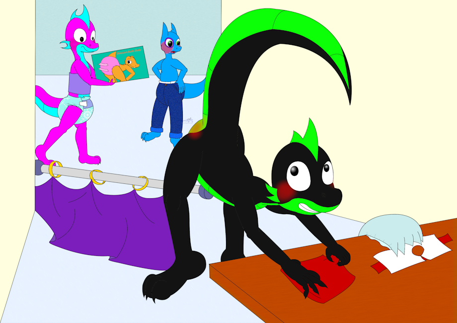In a Dressing room, Caius (Black anthro dragon with bright green belly and face fins), is bent over toward the camera, with his bare rear up in the air facing the opposite direction. He is blushing while his eyes look back in shock as the curtain rod fell down. His diaper is laying on the bench in front of him, unfolded and he is in the process of picking up red fabric.