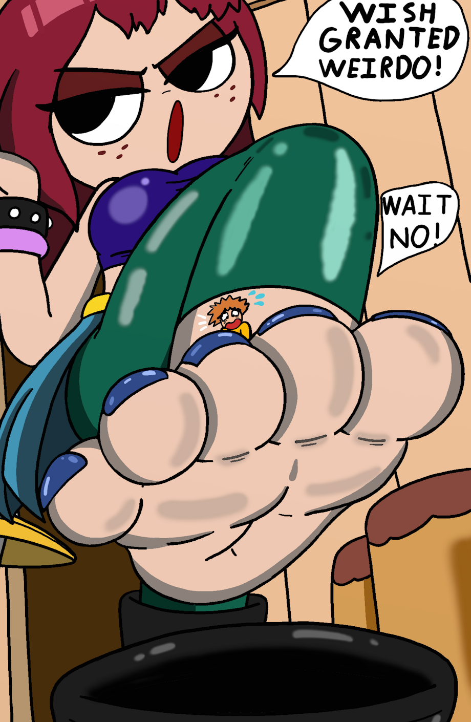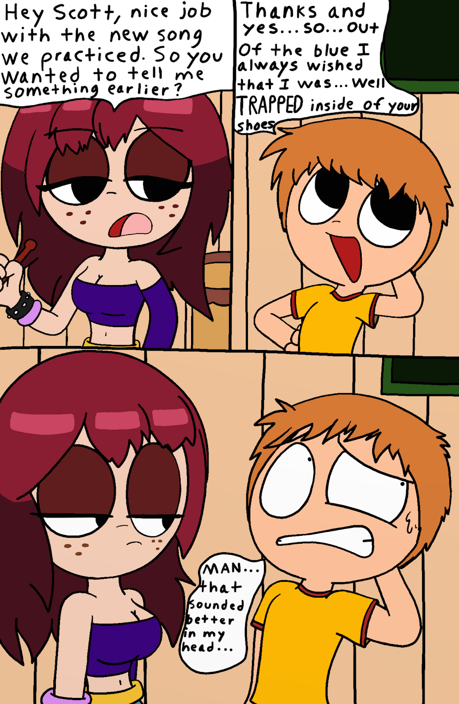Scott wanted to get closer to one of the girls and by close he meant trapped inside of one of their shoes so he decided to ask the very one who thinks he's a weirdo for doing it and granting him his wish just to humiliate him.
