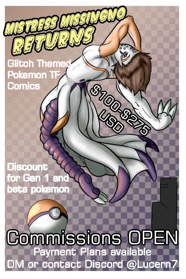 For a limited time I'm bringing back my Mistress MIssingno themed pokemon transformation comics. Only a few slots available so please send me dm or contact me via discord