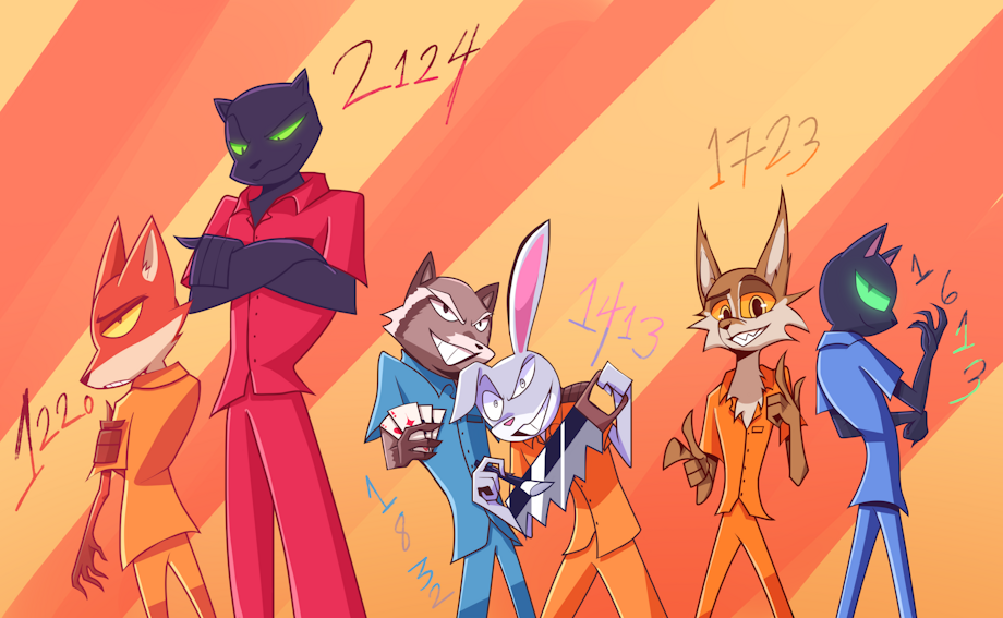 Boulderton Prison inmates from the furry prison RPG game Back To The Dawn. Thomas The Fox (main playable character), Bob The Black Panther (will be playable character later), Noodle The Raccoon, Whitey The Rabbit (they are magicians), Chris The Lynx and Bam The Grey Cat,