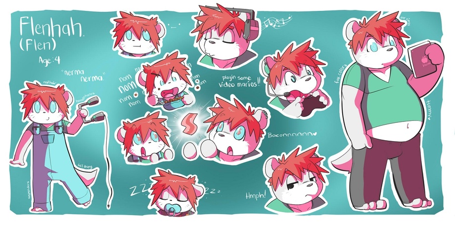 Flen is a Wolf\Otter mix. He has red hair, whiskers and grey fur with a white tummy. He has otter ears with a wolf's tail. He has a baby version and an adult version. Both are pretty much the same except he's gained a little weight over the years and he has some green earrings on the left ear.