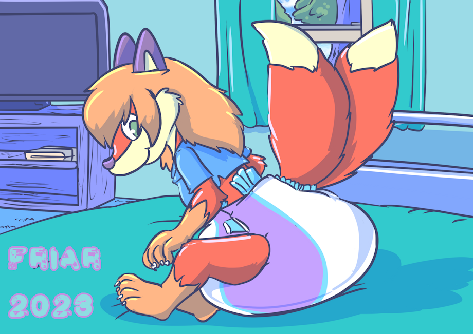 Illustration of Ozzy the wet and messy diapered two tailed fox sitting on Everett's bed.