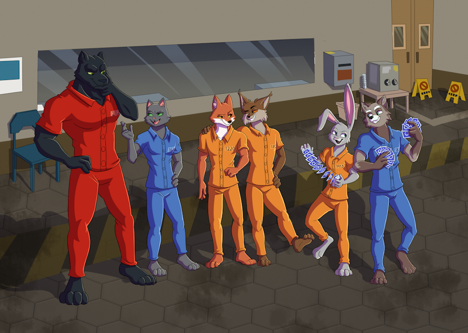 Boulderton Prison inmates from the furry prison RPG game Back To The Dawn. Bob The Black Panther (will be a playable character later), Bam The Grey Cat, Thomas The Fox (main playable character), Chris The Lynx, Whitey The Rabbit and Noodle The Raccoon (they are magicians)
