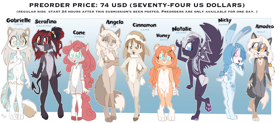 PREORDERS ARE 74USD EACH AND ONLY AVAILABLE FOR 24 HOURS! Bidding starts 24 hours after preorders, in a separate submission. Regular bids start at 21 USD, minimum increment is 5 USD and autobuy is priced at 53 USD.