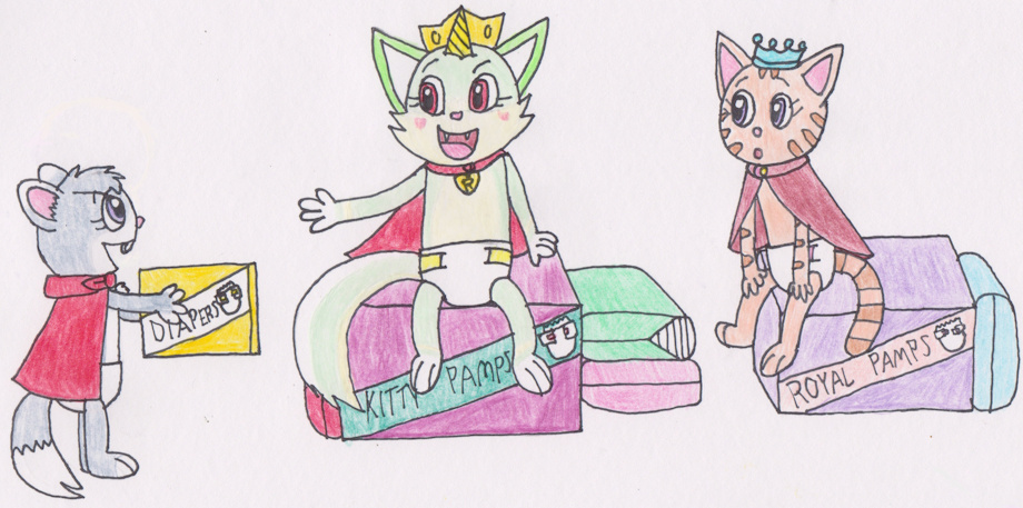 Jessica showing her package of diapers as an offering to the Diaper Queen Rhyme & Princess Elsie
