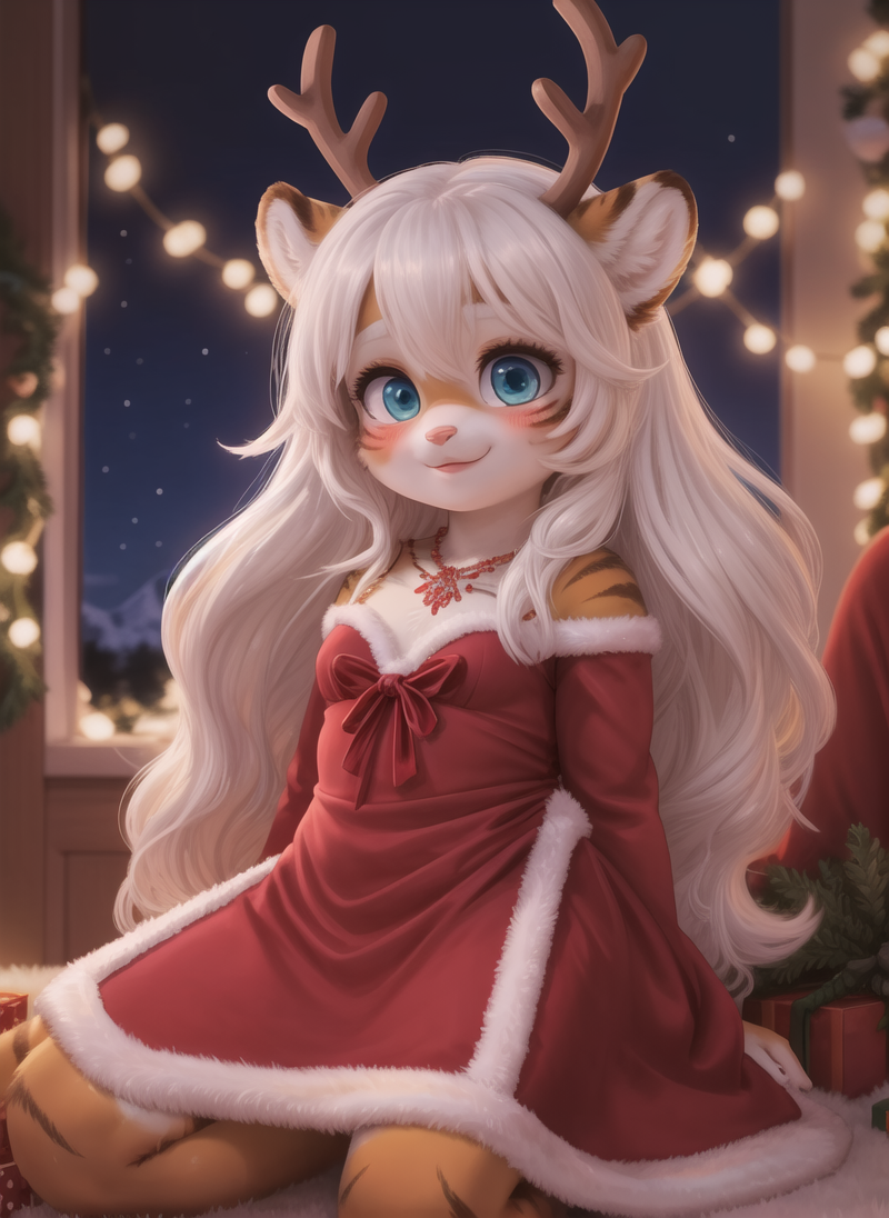 Not quite willing to name it a Bhavani image because in two of these didn't have her stripes, which is a bug with the Christmas lora. Still cute, wanted to share. The hands where a bit of a problem, so going to pose them behind her for the next few batches.