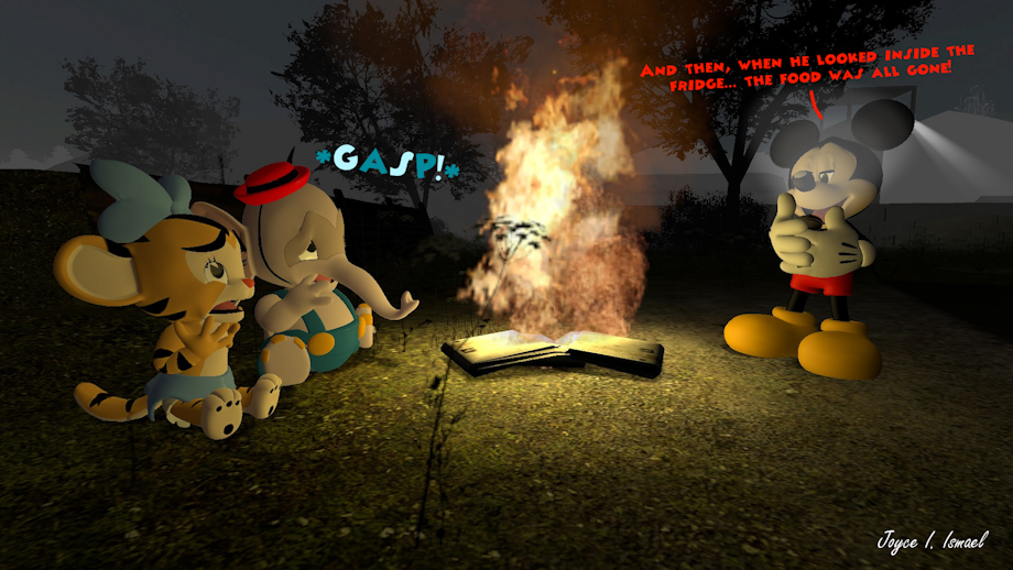 I've always wanted to do this back when I had my old computer, but now I've decided to remake it in my current laptop! Here's Mickey telling spooky campfire stories to Elmer and Tillie. ...I think he took it too far. 😅