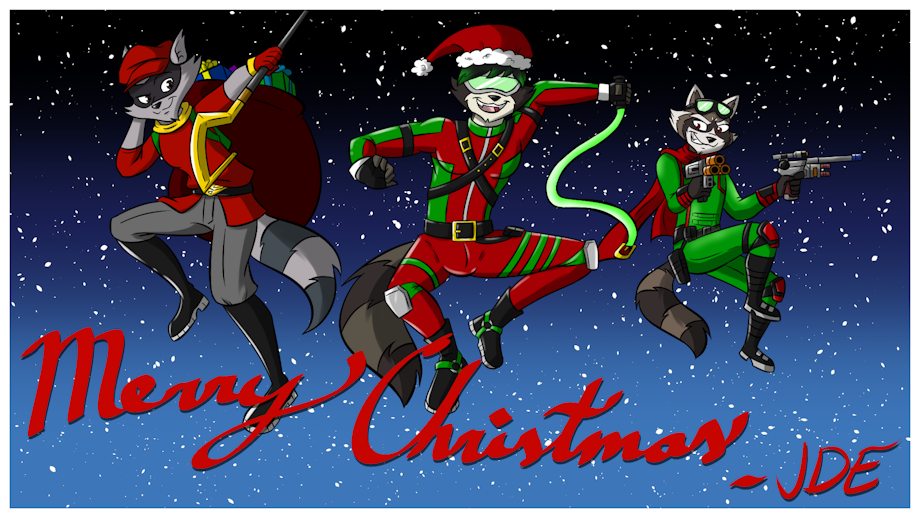 Wanted to do something featuring my anti-hero character, the Buckler. And I thought to include a couple of my favorite raccoons from other media. Sly Cooper from the Sly Cooper game series, and Rocket Raccoon from the Marvel Comics and MCU.