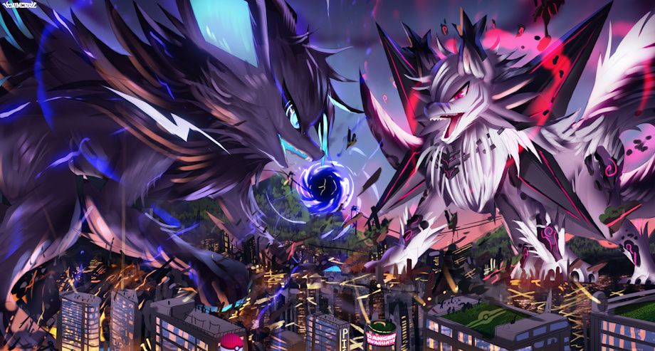 The epic show down between Jolteon and Lycanroc, both in there mega forms and bigger than the whole city~ This is going to be one expensive battle for there trainer.... But oh well <3