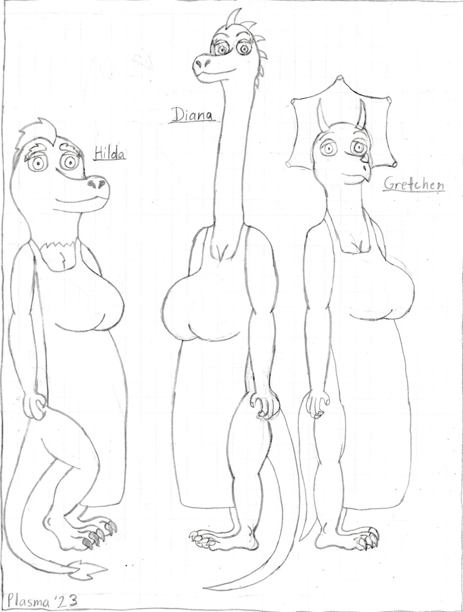 Sketches of my 3 dino ladies, Hilda the t-rex (Vivian's mom), Diana the diplodocus, and Gretchen the triceratops.